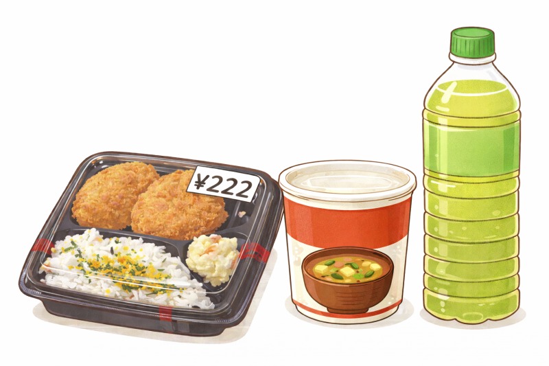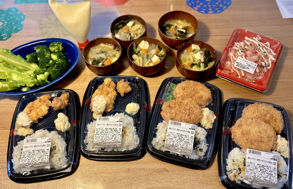 👉 222円弁当をメインにして、具だくさんの汁物を足す