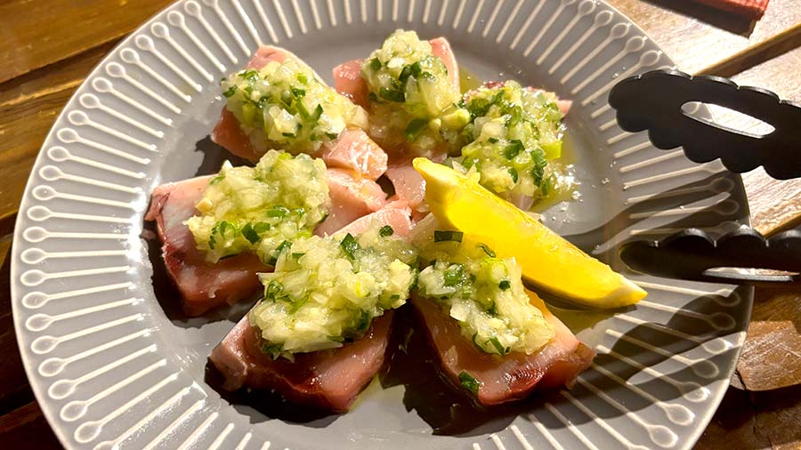 3位|勝浦産めじまぐろのカルパッチョ 葱としょっつるのソースで(1,045円)
